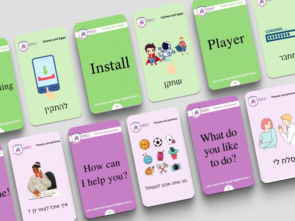כרטיסיות דו צדדיות המלמדות 16 קטגוריות מילים חשובות בשפה האנגלית באופן חווייתי ומהנה.